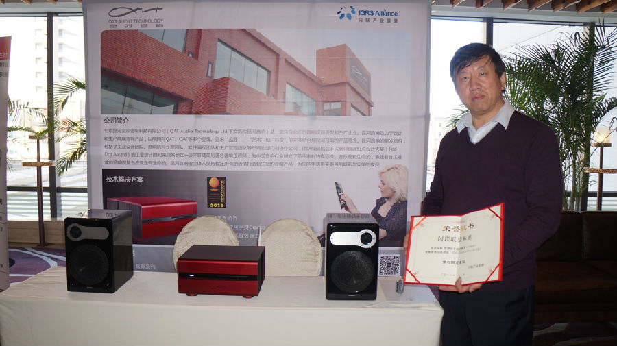 本次峰会最重要的环节是颁布了“2013年信息设备资源共享协同服务(IGRS)智能音频互联协议(IGRS0003.04-2013)”。本协议对资源共享协同服务协议下音频设备之间的资源的共享和协同模式做出了规范,并适用于各种具有网络连接的音频设备。在证书的颁布过程中,昆河音响总经理梅弘夫先生受邀上台领取了闪联标准荣誉证书。